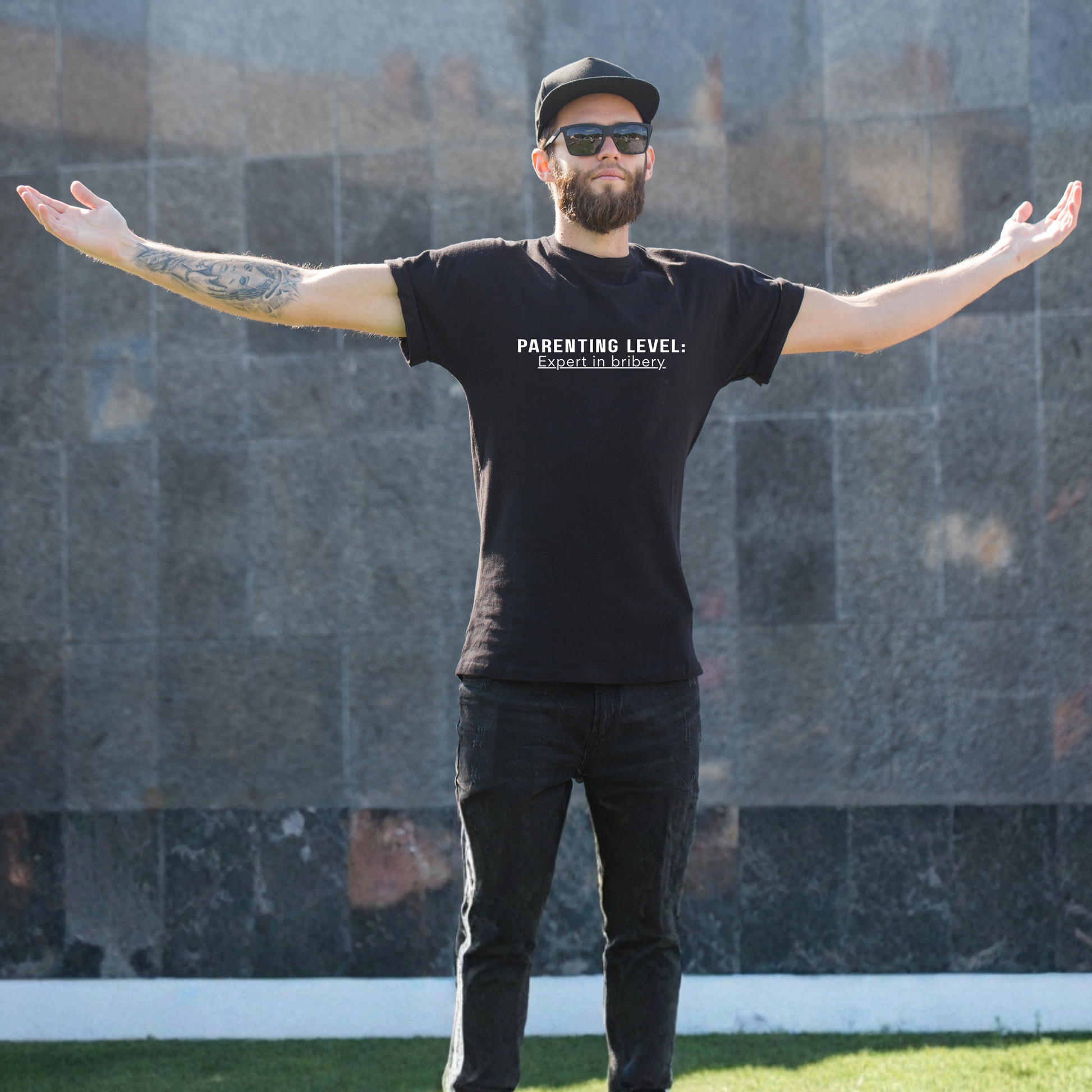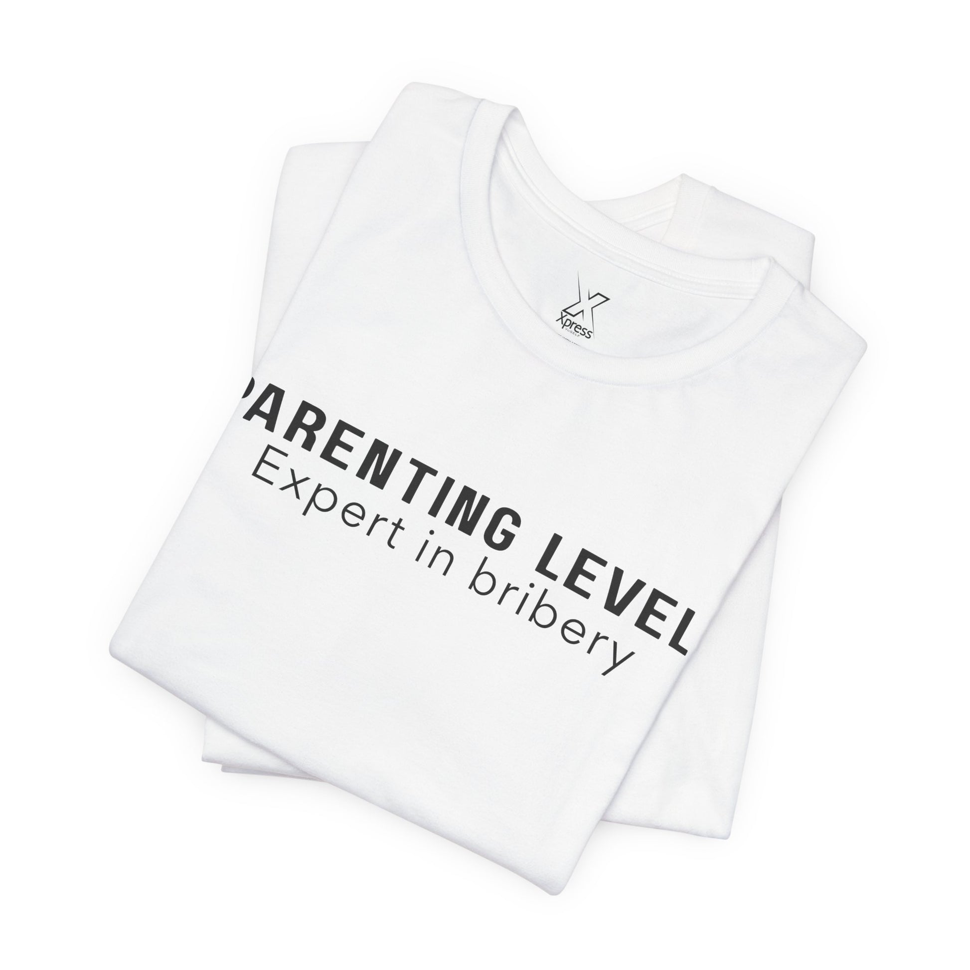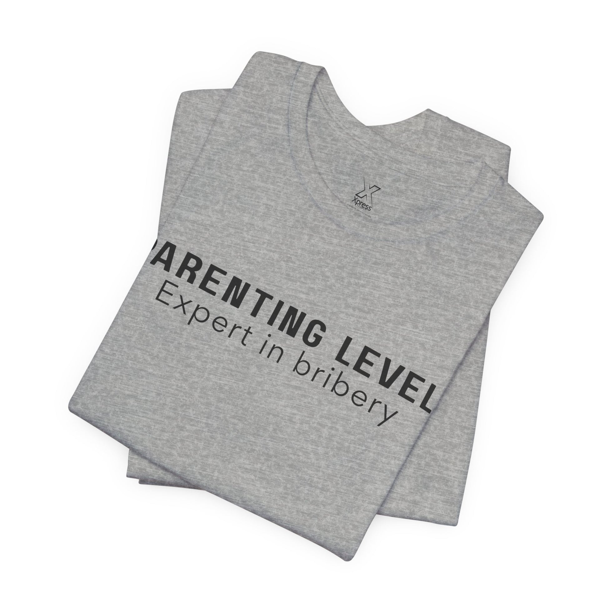 Parenting Humor Shirt | Unisex T-Shirt | Funny Parent Tee | Gift for Moms and Dads | Casual Family Outfit | “Parenting Level: Expert in Bribery”