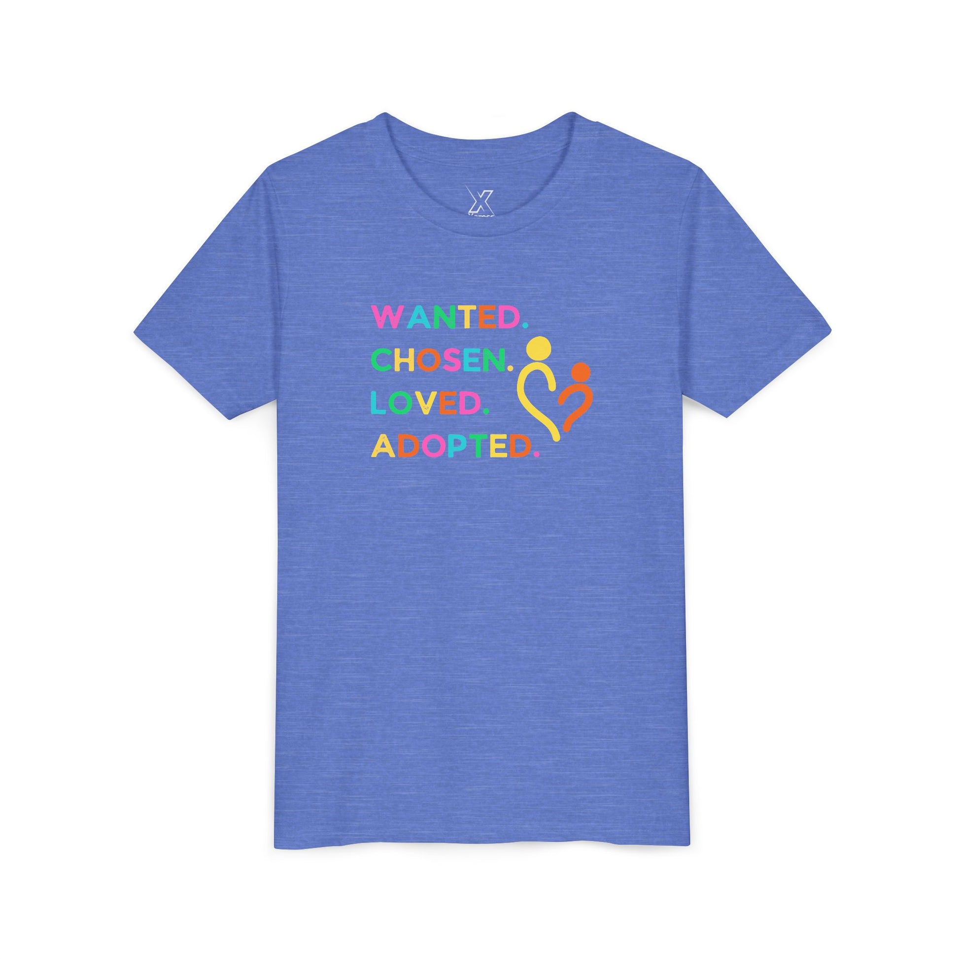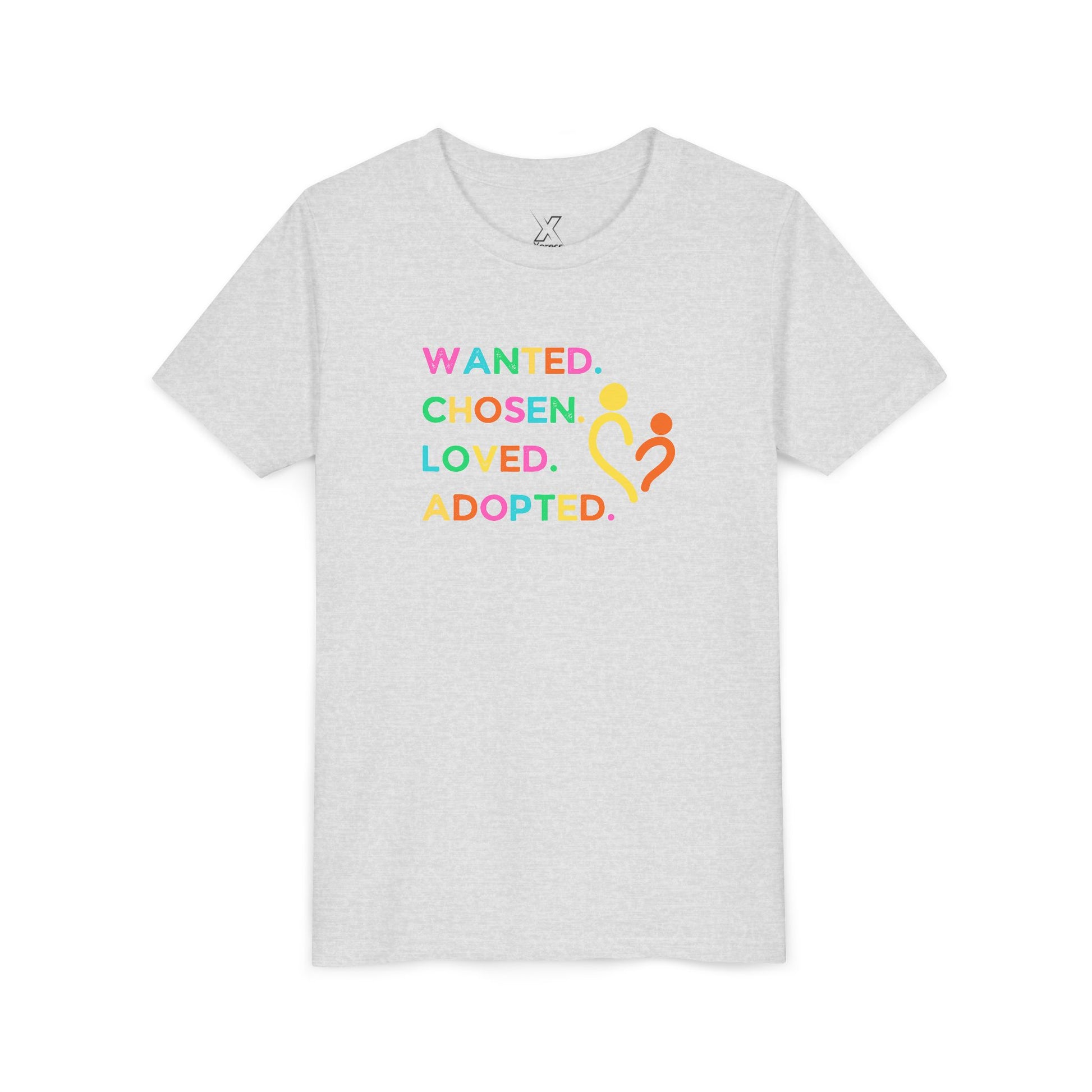 This Youth Short Sleeve Tee embodies comfort and love, making it perfect for kids who want to express their unique selves. The cheerful design—featuring the words 'WANTED. CHOSEN. LOVED. ADOPTED.'—radiates positivity, celebrating the joy of being chosen and cherished. Ideal for everyday wear, it pairs well with jeans, shorts, or skirts, making it a versatile addition to any child's wardrobe. This tee is a thoughtful gift for adoption celebrations, family gatherings, or casual outings. Parents seeking to instill values of love and acceptance will find this product resonates deeply with them and their children. It's perfect to wear during special occasions, like Adoption Awareness Month or Family Day, promoting a sense of belonging and warmth.